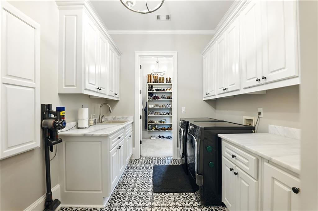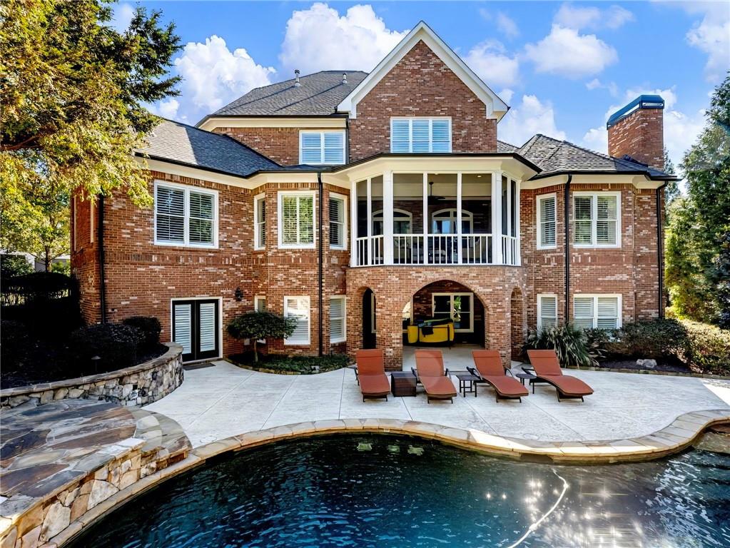 Welcome to 2785 Shumard Oak Drive, an oasis within the prestigious Chateau Elan community. This brick and fieldstone-accented estate is thoughtfully designed and richly detailed, offering timeless architecture, expansive living spaces, and effortless indoor-outdoor living. With six bedrooms, five full baths, and two half baths, this home is move-in ready. The grand two-story foyer is filled with natural light and leads seamlessly into a formal dining room with plantation shutters, layered tray ceilings, and custom trim. A graceful arched opening connects the dining area to the gourmet kitchen, the heart of the home. French country-inspired details, a statement gas cooktop surround, granite countertops, white cabinetry, stainless appliances, and a two-tiered island create a space both functional and elegant. A nearby butler’s pantry offers additional storage and prep space. The adjoining keeping room features a vaulted ceiling with exposed beams, a cozy stone fireplace, and tall windows that bathe the space in light. A turret-style breakfast nook opens to a screened porch overlooking the backyard oasis. A formal living room tucked nearby features a coffered ceiling, built-ins, and a fireplace framed by refined trim work. Large arched windows provide a serene view of the covered porch and pool. The main-level owner’s suite is a private retreat, complete with a double tray ceiling, sitting area with fireplace, and a garden door to the porch. The spa-like bath includes dual vanities, a soaking tub, an oversized shower, and direct access to a walk-in closet and laundry room. Also on the main level: a powder room, granite-topped office nook, and access to a four-car garage through a secondary entry foyer. Upstairs, additional bedrooms and flex spaces offer features like tray ceilings, walk-in closets, and en-suite baths. The finished terrace level features full-size windows, tile floors, a second kitchen and bar, living room with fireplace, gym, office, full bath, and a theater with terraced seating and wet bar. Outside, the lagoon-style pool and spa are surrounded by flagstone coping, lush planters, and a waterfall feature. A shaded patio and a brick and stone pavilion complete the resort-style experience with a full outdoor kitchen, vaulted ceilings, and a half bath. This is more than a home, it’s a lifestyle, perfected inside the gates of Chateau Elan.