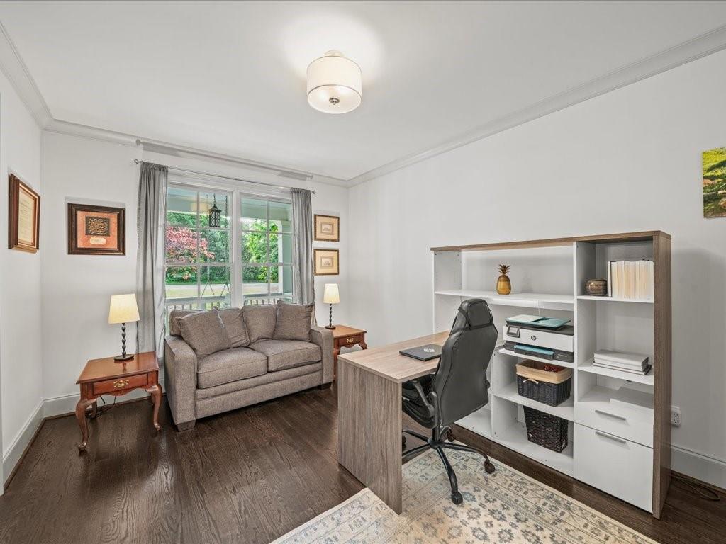 Welcome to this stunning, move-in ready home nestled on a private, level lot in the heart of Dunwoody. A charming covered front porch invites you into a light-filled interior with rich hardwood floors throughout. The foyer is flanked by a spacious home office (or formal sitting room) and an elegant dining room—perfect for entertaining. The family room is the true heart of the home, featuring a beamed ceiling, a wall of windows, a cozy fireplace, and custom built-in bookshelves. The chef’s kitchen is a showstopper with an oversized quartz island, abundant cabinetry, under-cabinet lighting, a beautiful backsplash, and high-end stainless steel appliances including a gas range, vent hood, and double ovens. A walk-in pantry and a well-designed mudroom off the two-car garage add convenience and function.Walk out to the large deck overlooking the beautifully landscaped, fenced backyard—perfect for relaxing or entertaining. Capping off the main level is a guest suite with a full bath. Upstairs, the expansive primary suite offers a luxurious retreat with a spa-like bathroom featuring a double granite vanity, separate soaking tub, frameless glass shower, and a massive walk-in closet. All secondary bedrooms have en-suite bathrooms, and there's a versatile bonus room ideal for a media space, gym, or playroom. The full, unfinished basement is already stubbed for a bathroom—offering endless potential for future expansion. All of this, within walking distance to Dunwoody Village, top-rated schools, and everything this vibrant community has to offer. Don’t miss your chance to own this exceptional home in a prime location!