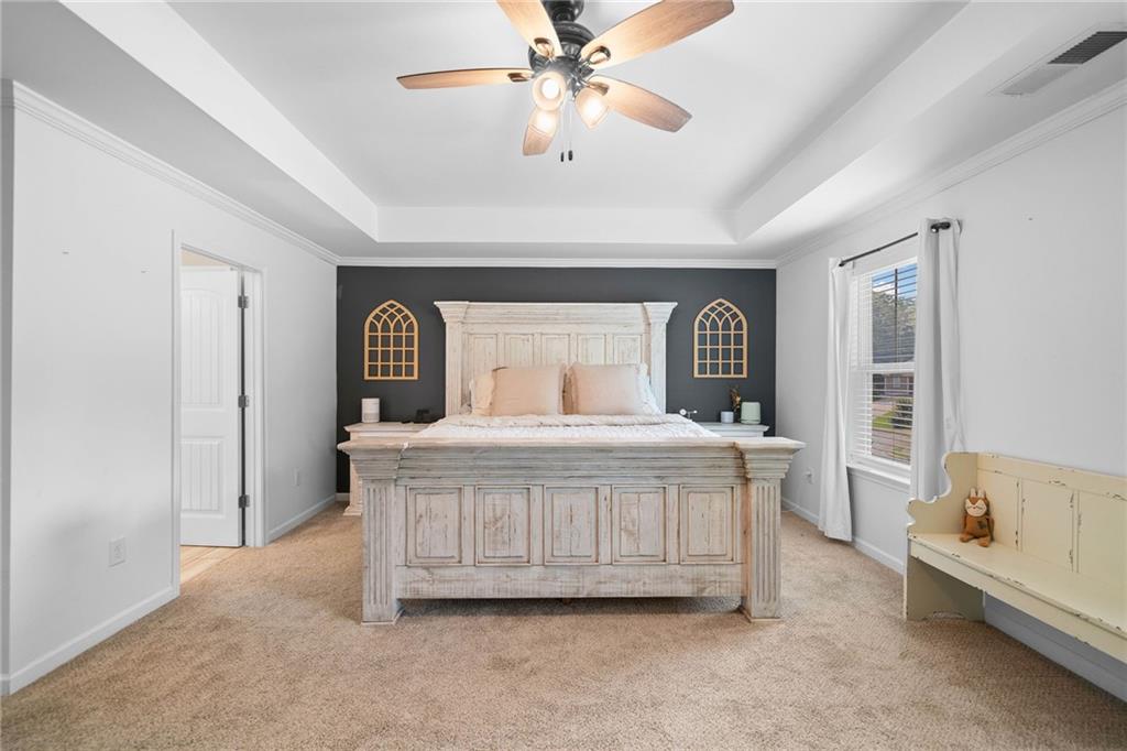 Welcome to the charming community of Foothills at Rydal! When arriving to 13 Four Feathers Lane, you notice the quiet of the cul-de-sac and inviting rocking chair porch. Welcoming you into the home, the entryway draws your gaze upward to admire the grand two story foyer and showcasing the extraordinary open stairway. Leading into the dining room, you will find beautiful coffered ceiling and wainscot molding, which can be used as a formal dining room or office. As you enter the kitchen, you will be greeted by a large eat in kitchen with granite countertops, stainless steel appliances and walk-in pantry. You can only admire the oversized 5x8 island with plenty of gathering space for entertaining family and friends. Opening into the family room is where natural light cascades through many windows, creating a bright and airy atmosphere to cozy up to the beautiful stone wood burning fireplace. The open-concept layout seamlessly joins the family room area and kitchen with thoughtful design. As you explore the upstairs you will enjoy the owner's suite, with trey ceiling, and the newly installed carpet. This enormous retreat features an ensuite bathroom with dual vanities and large shower all with an enormous walk-in closet. Not to disappoint, the sunny secondary bedrooms are spacious with vaulted ceilings and newly installed luxury vinyl plank flooring. The upstairs bathroom includes dual vanity and newly installed floor as well. The laundry room is conveniently located in close proximity to the upstairs bedrooms. 10' walls and wainscoting are some of the details throughout this home. Step outside to discover the tranquil and highly pleasing outdoor living space that is perfect for lounging, recreation or hosting barbecues. Here, you can enjoy a covered porch that invites you to unwind and take in the serene oasis. Private yard surrounded by trees in back of the yard and privacy fencing all on .70 acres of this property which is beautifully landscaped and sodded. This exceptional home is meticulously maintained and is ready for its next owner! Community Perks: Take a dip and relax in the sparkling community pool, splash pad, and book your next event at the Club House. Don't miss out on this incredible opportunity! Schedule your tour today and envision your future in this stunning modern home. This location is minutes from downtown Rydal, and an easy drive to Cartersville and highway I-75. Convenient to parks, trails, shopping and dining!