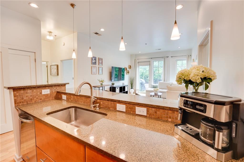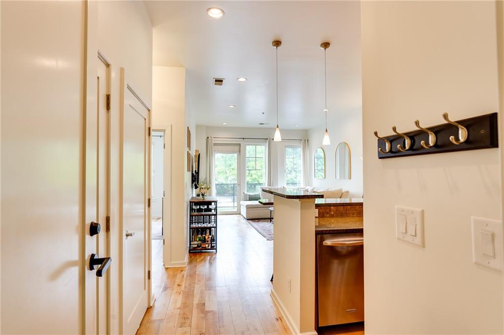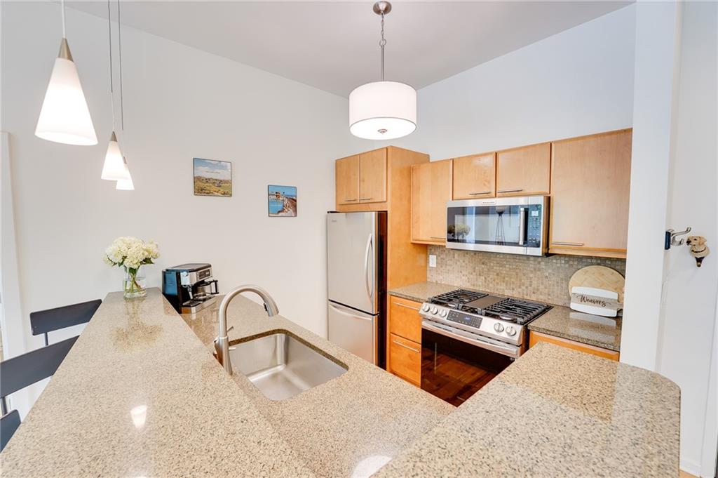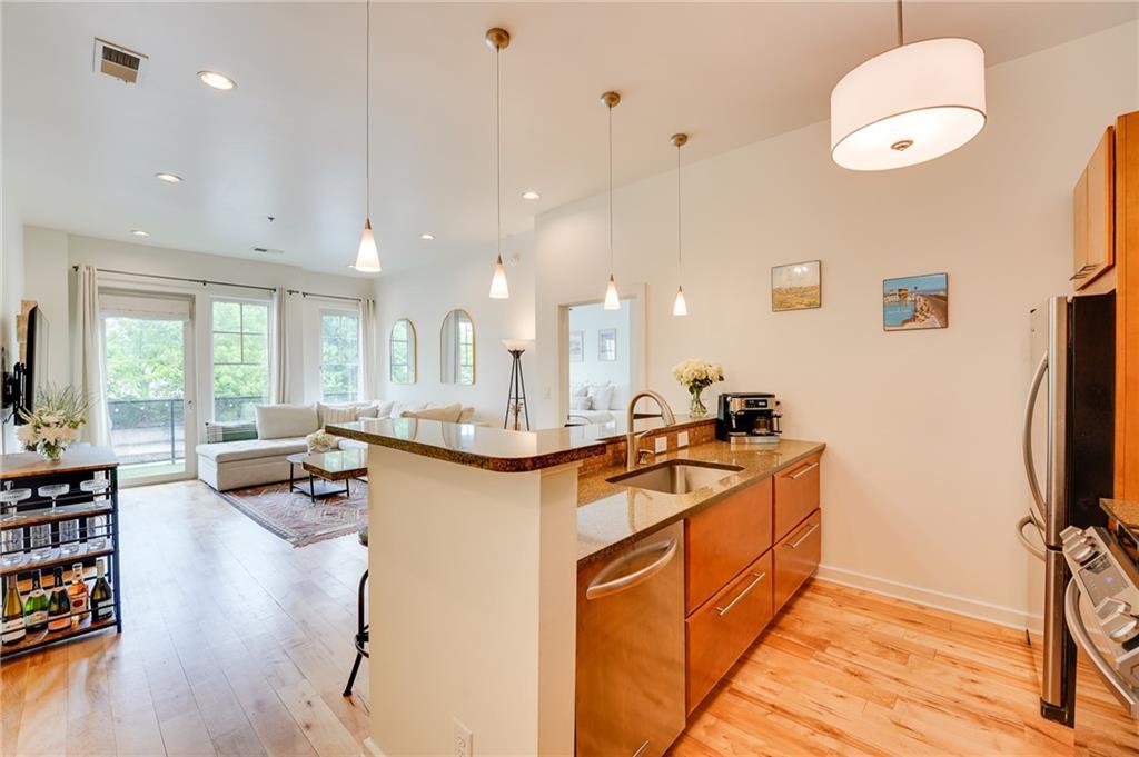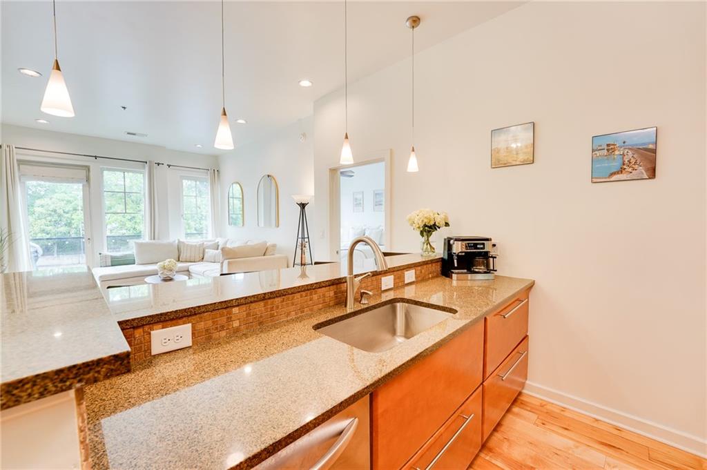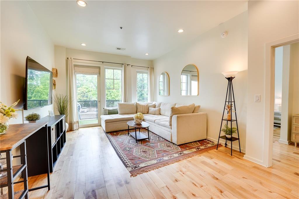 Come make this spacious and light-filled 2-bedroom, 2-bathroom condo offering modern comfort and unbeatable convenience your home! The open-concept layout features large windows that bring in abundant natural light and a neutral color palette that complements any décor. The living area opens to a private, oversized balcony—perfect for relaxing or entertaining. The kitchen is designed for both functionality and style, with granite countertops, stainless steel appliances including a gas range (2021), wood cabinetry, and a bar-height counter with seating. Overhead, three pendant lights provide ambient lighting, enhancing both function and charm. The primary suite includes a double vanity and a sleek glass-enclosed tiled shower for a spa-like feel. Additional features include gated garage parking with two assigned spaces, in-unit laundry, and light hardwood flooring throughout. Conveniently located near shopping, popular restaurants, parks and schools. This home is perfect for anyone seeking the Brookhaven lifestyle. Move-in ready and minutes from all that Brookhaven has to offer!