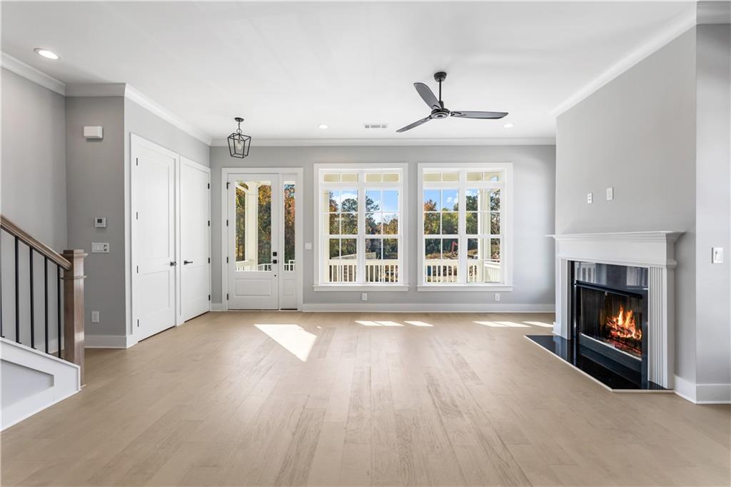 Gorgeous! Gorgeous! 2 years new, practically brand new END UNIT townhouse in the perfect location! Right across from East Roswell 40 acre park that has walking trails, playground areas, community building, baseball, soccer and lacrosse fields. Awesome front porch greets you as you come up the front steps. Once inside the front door the first thing you notice is the 10' ceilings that are on the main level and top level. Practically the entire unit has wide plank hardwood floors and an open floor plan designed for modern living. The large great/family room with a gas fireplace and gas logs and lots of windows opens up into the kitchen area. Gorgeous open/light/bright kitchen with white cabinets against the wall and painted cabinets on the island, quartz counter tops, stainless appliances, huge island, 5 burner cooktop, stainless overhead vent, built in oven and microwave, refrigerator and tiled backsplash. Large breakfast room with lots of windows and natural light. Upstairs laundry room plumbed for a wash basin sink and washer and dryer included. Nicely sized owners suite with his and her closets and hardwoods. Owners bathroom is gorgeous as well with huge frameless shower with tiled bench and floor to ceiling tiles, double quartz vanities, tiled floor. Two nicely sized additional bedrooms upstairs and hallway bathroom with double quartz vanity and sinks. Lower level has a bedroom with hardwoods and a full bathroom. The side entry 2 car garage is very large and has a separate door for access outside. This townhouse is absolute perfection inside and out! Trash and water included
