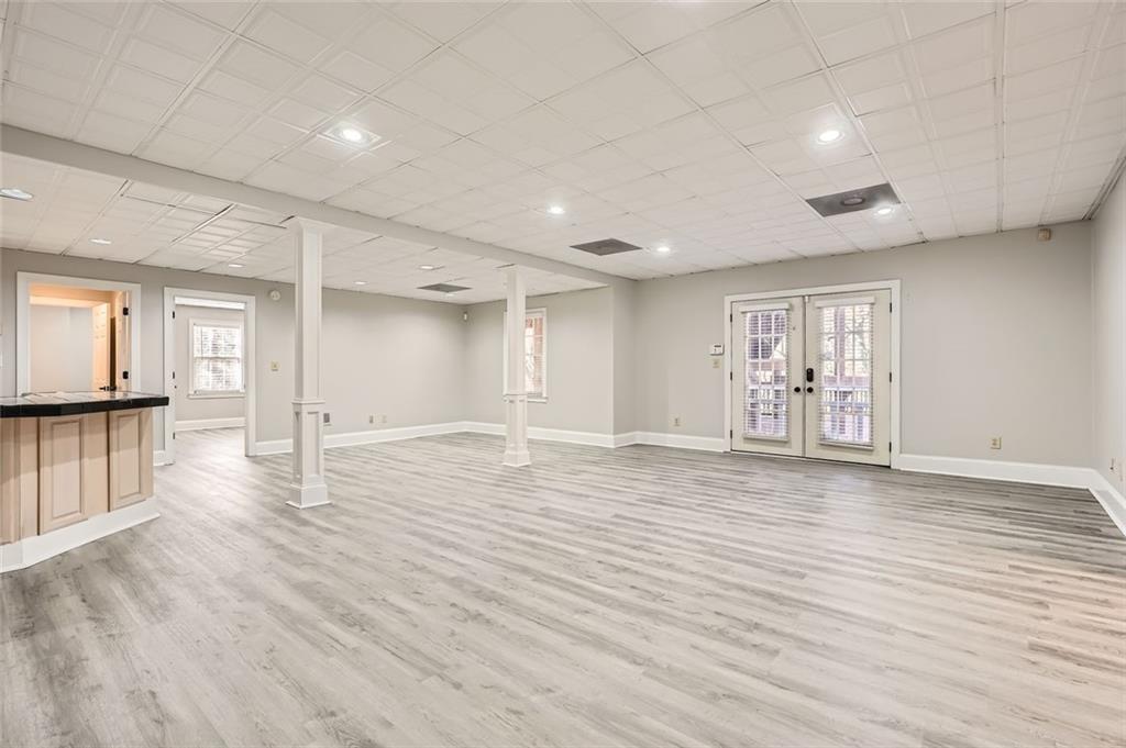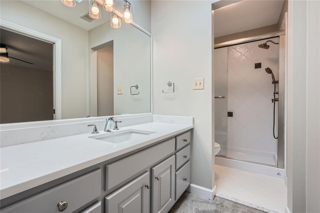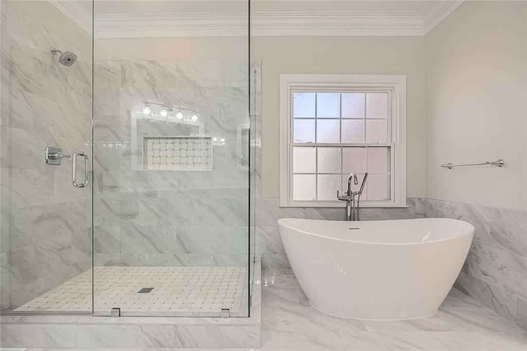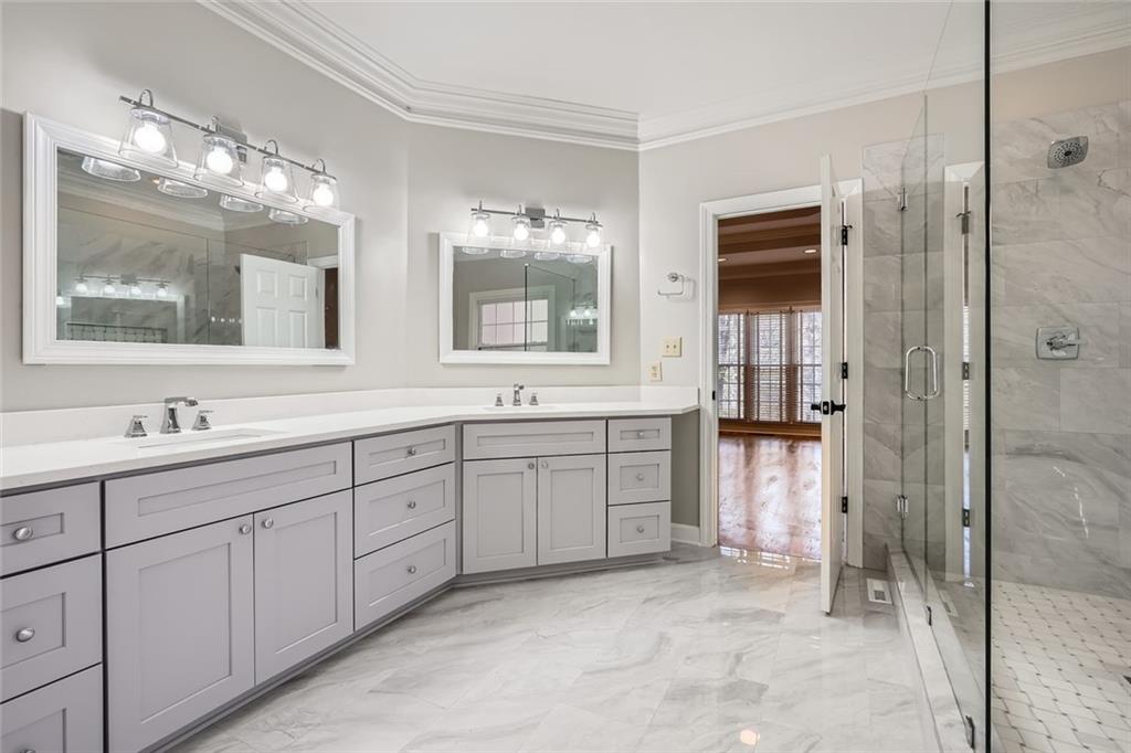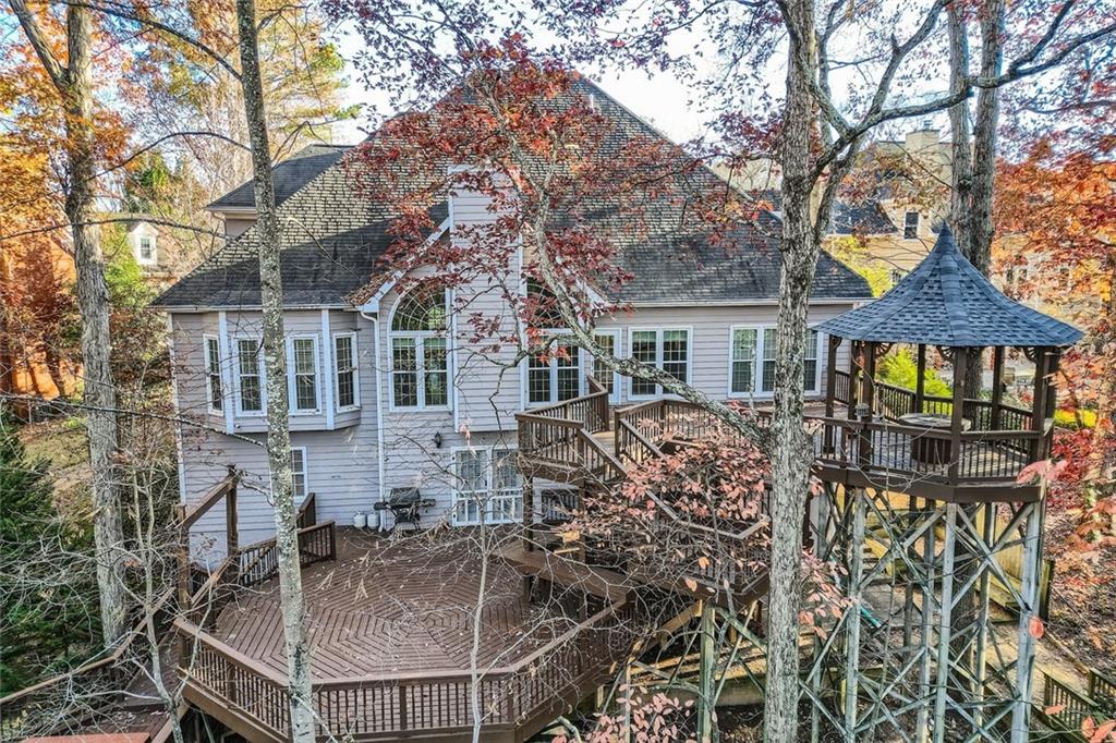This wonderfully renovated entertainer's dream home features 6363 s.f. of finished space. Located in the heart of Smyrna/Vinings, it's close to schools, shopping and fine dining, with convenient access to major highways and the airport. Enter into an open floorplan with a banquet-sized dining room and two-story vaulted family room with fireplace, right off the kitchen and breakfast area. The private living room with cozy fireplace could also serve as a great office or library. Large open kitchen with gorgeous quartz counters and butler's pantry is open to the family room and gigantic multi-level deck. Huge primary suite on the main level with multi-tiered tray ceiling and luxurious bath featuring twin sinks, tiled frameless glass shower, soaker tub, and spacious closet/dressing room. At the opposite side of the main level there is a private in-law/nanny suite that was used by the owner as a home office with elegant built-in cabinetry. Upstairs there is a private bedroom with en-suite bathroom, two more bedrooms with jack and jill bath, plus a bonus room that could serve as a playroom, dressing room, or study. You will also find a finished storage area with a permanent stair to even more floored storage in the attic. The finished terrace level is a complete living quarters with bedroom, bath, full kitchen, great room, rec. room, 2nd washer/dryer and private exterior entrance. The rec room would easily convert to a great media room if desired. There is also 774 s.f. of unfinished workshop and storage space with an exterior entrance. The exterior features include a multi-tiered deck with elevated octagonal party deck and covered gazebo, a 10-foot outdoor projection screen, a separate ground level 6-seat hot tub deck, and an amazing connected tree house. This ideal location is in a dead-end cul-de-sac, close to award-winning Teasley Elementary and within a short distance to any of a long list of excellent private schools, Braves stadium, downtown Atlanta, Roswell, and Marietta.