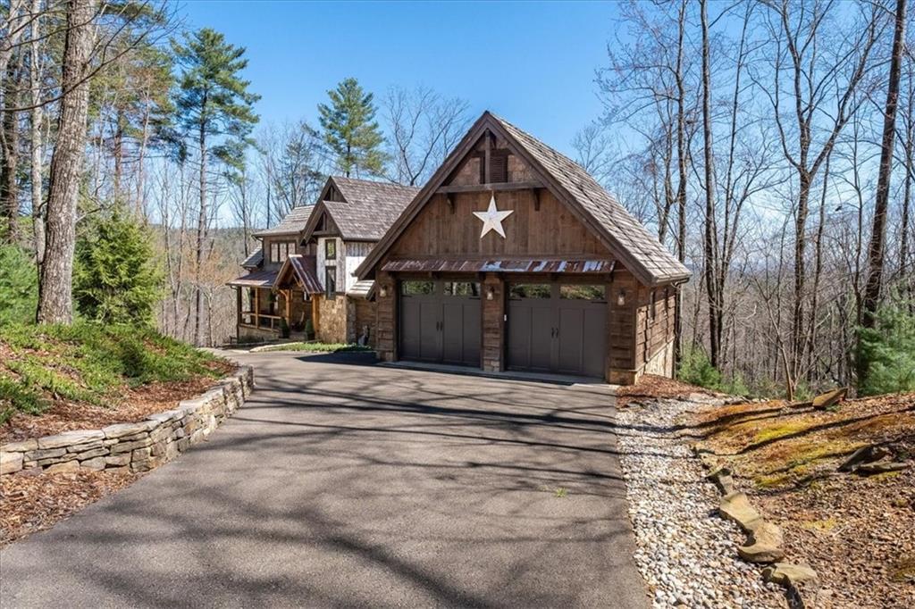 Nestled in the heart of the exclusive Utana Bluffs, a hidden gem seamlessly woven into nature, this extraordinary mountain retreat offers an unparalleled blend of luxury and rustic elegance. Surrounded by the breathtaking expanse of national forest, this premier community features a social clubhouse that is the site of community bonding, chef dinners, and more, along with a gym and game room, miles of scenic hiking trails, a tranquil waterfall, owner caretaking services, and a welcoming, tight-knit atmosphere all composed of natural finishes to meld into the surroundings. Crafted with impeccable attention to detail, this home is a masterpiece of reclaimed wood and tin, crowned with a hand-split cedar shake shingle roof. The thoughtful design incorporates one ton of glass in its expansive windows, ensuring uninterrupted views of the magnificent layered mountain vistas on every level of the home. Step inside to a grand great room with beamed ceilings, a striking floor-to-ceiling stone fireplace, and an open layout that effortlessly flows into the dining area and chef's kitchen. The kitchen is a culinary dream, featuring a massive island, Viking appliances, and a walk-in pantry. The main-level primary suite is a sanctuary unto itself, boasting vaulted beamed ceilings, a generous walk-in closet, and a spa-like en-suite with dual vanities, a soaking tub, and a walk-in tiled shower. The main level rear deck spans the length of the house, with covered seating area including a stone finished, wood-burning fireplace. A convenient mudroom, laundry room, and half bath complete the main level. Upstairs, a cozy loft with breathtaking views leads to two spacious bedrooms connected by a Jack & Jill bath, each with its own private vanity and toilet area. The terrace level is an entertainer's dream, featuring a large living space with a second stone fireplace, French doors leading to a covered deck, and an adjoining glass-enclosed wine room with capacity for over 100 bottles. The lower-level primary suite has been transformed into a custom bunk room with a unique three-tier bunk bed and additional sleeping space, complemented by an en-suite bath with a custom dual vanity and tiled shower. An expansive finished area offers endless possibilities-perfect for a sportsman's retreat, additional living space, or a game room. The terrace level also includes its own full-length outdoor deck with a wood-burning pizza oven, and leads to a stand alone deck where you can enjoy the massive views while soaking in a Hot Springs Spa brand hot tub. A two-car garage fashioned with the same materials as the home and harmonious landscaping/hardscaping complete the exterior. Custom craftsmanship and thoughtful details define this exceptional home, seamlessly blending luxury and nature in one of North Georgia's most prestigious mountain communities. Don't miss the opportunity to own this breathtaking retreat in Utana Bluffs!