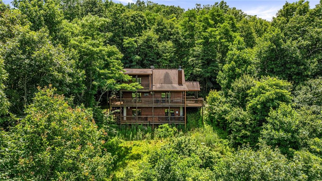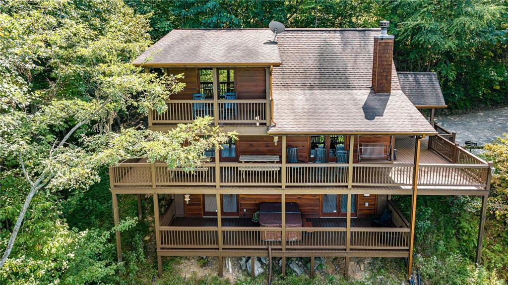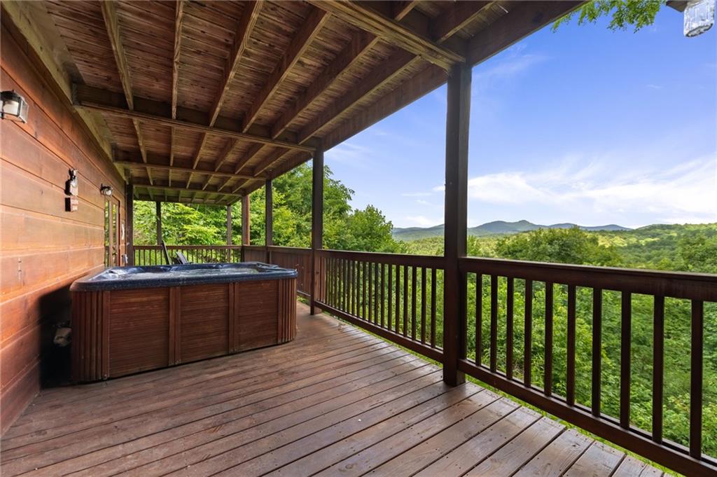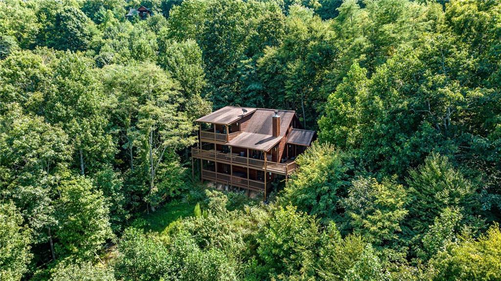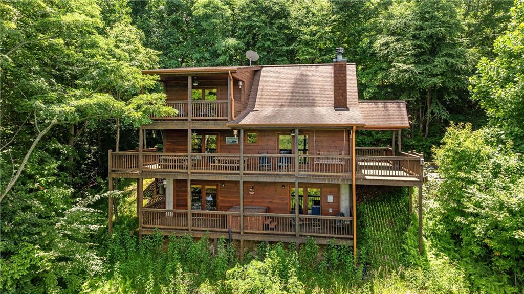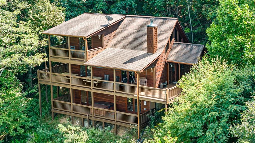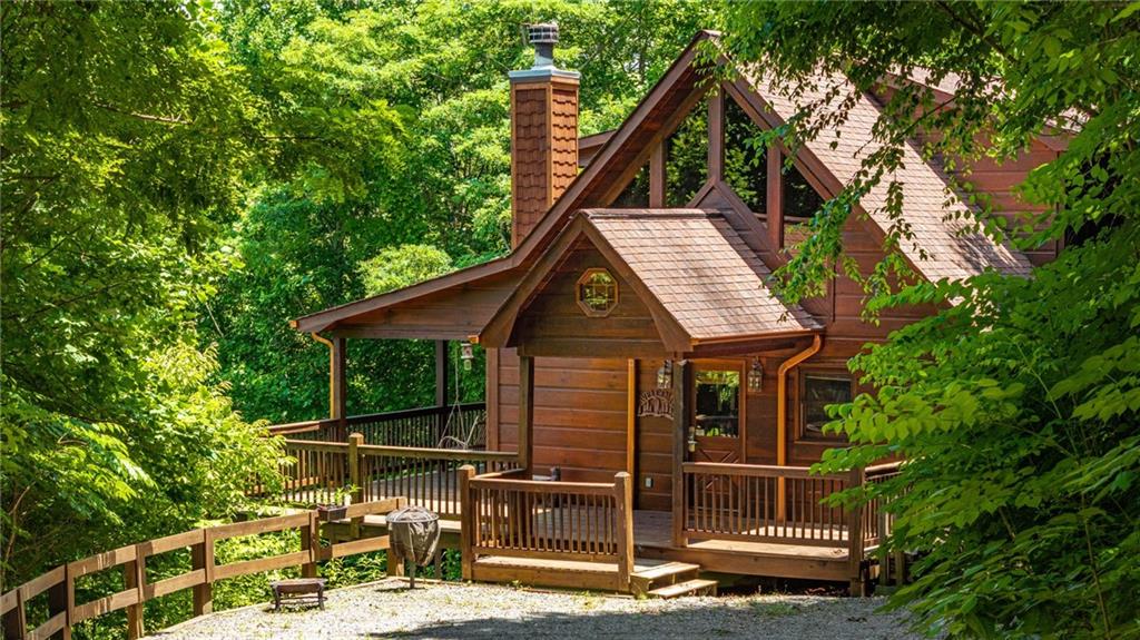 If you have "High Expectations", then this is the mountain getaway for you! You will be wowed by the magnificent long-range and close mountain views from multiple spots throughout. Featuring three levels with a bedroom and bath on each, along with loft living space and basement den/game room, this is the perfect layout for everyone to have their own space yet still be together. The spacious great room has a floor to ceiling custom stone, wood-burning fireplace, dining area, and kitchen with island seating and plenty of room for making culinary creations. The upstairs bedroom has its own private deck plus a soaking tub in the en suite bath. The lower floor features more lounging space perfect for movie watching, a pool table, foosball, and deck with hot tub to enjoy the magical views while you relax. Enjoy the babble of a small brook that runs along one side of the property. Finished with cozy wood throughout, rustic furnishings, and sold turn-key, you are ready for your private getaway or for use as an income-generating vacation rental. Located in the prestigious Mountain High subdivision with paved roads and underground utilities, you are in the middle of hiking, shopping, sightseeing, and more plus an easy drive to bustling Downtown Blue Ridge or Murphy, NC! Come see the home that will meet your "High Expectations" today!
