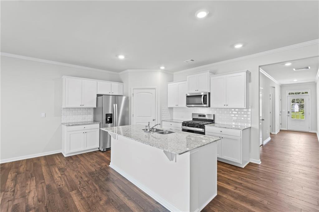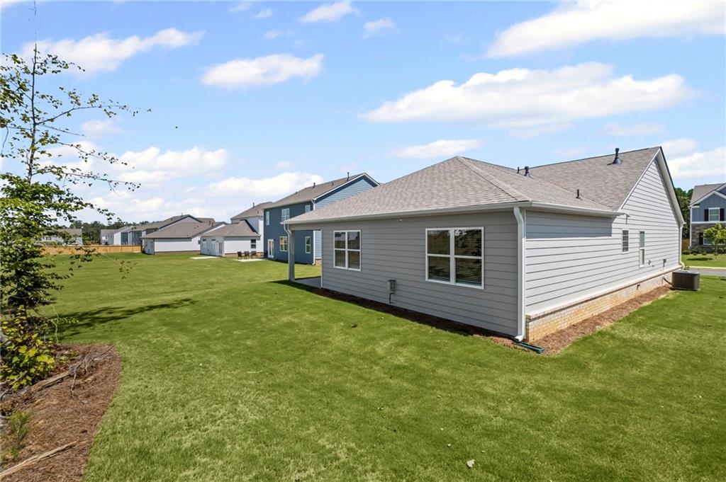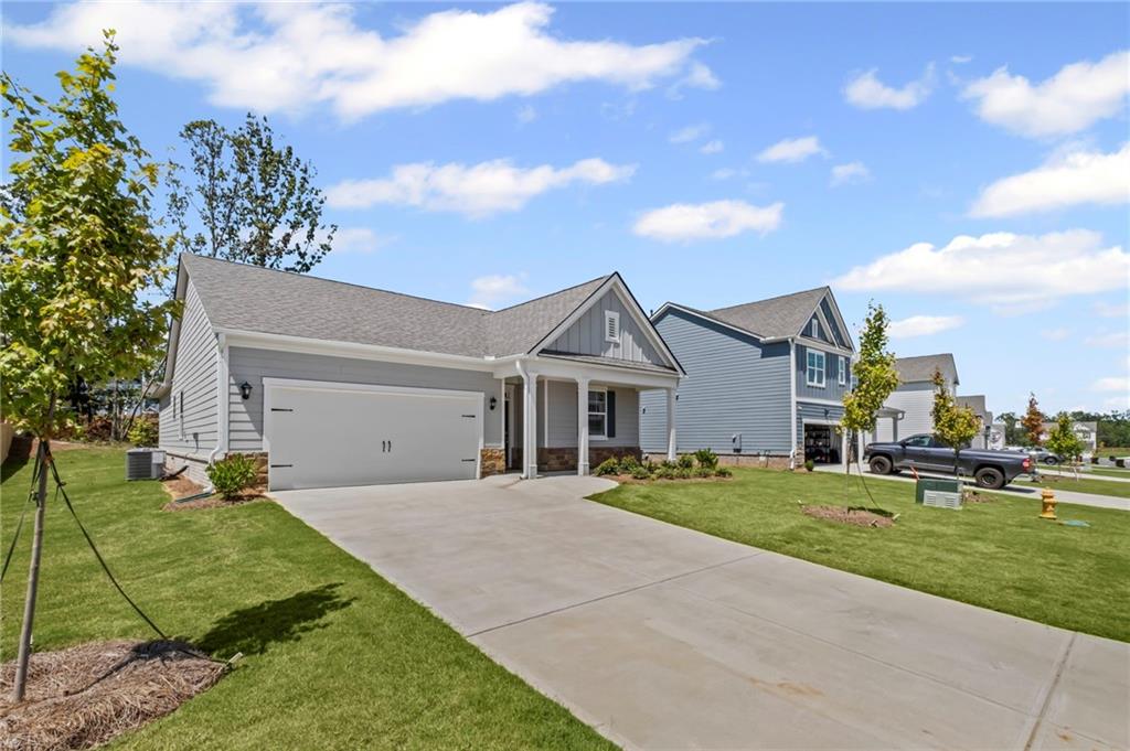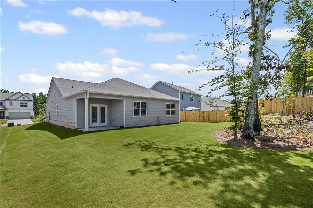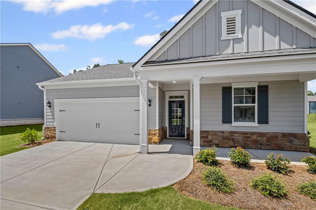 Welcomes you to 65 Grove Springs Court, a new construction single-family home in Parkside at Carter Grove community. This Cali, 4 bedroom and 2 bathroom ranch floor plan home, has a lot to offer your family in the 1,774 square feet. Your family can enjoy spending time outside in the large, flat backyard. A long foyer leading to the main living area and bedrooms welcomes you as you enter this home from the front porch. At the front of the home, 2 secondary bedrooms are split by the guest bathroom. Each bedroom boasts a walk-in closet, including the 3rd bedroom that is the perfect size for an office space or guest bedroom. The laundry room sits right outside of this room providing easy access for all to do laundry. Continuing deeper into the home, you walk into the open concept kitchen and living area. The chef in the family will enjoy all the kitchen has to offer including, stainless-steel appliances, granite countertops, white shaker cabinets, and a large walk-in pantry. An oversized island separates the kitchen from the dining area. Enjoy spending time with family and friends in the spacious living room or outside on the covered back patio. The primary suite is tucked away to the back of the house, off of the living room, providing privacy homeowners can use to relax and unwind. The primary suite comes with a considerable walk-in closet, dual vanity, and separate walk-in shower and soaking tub.