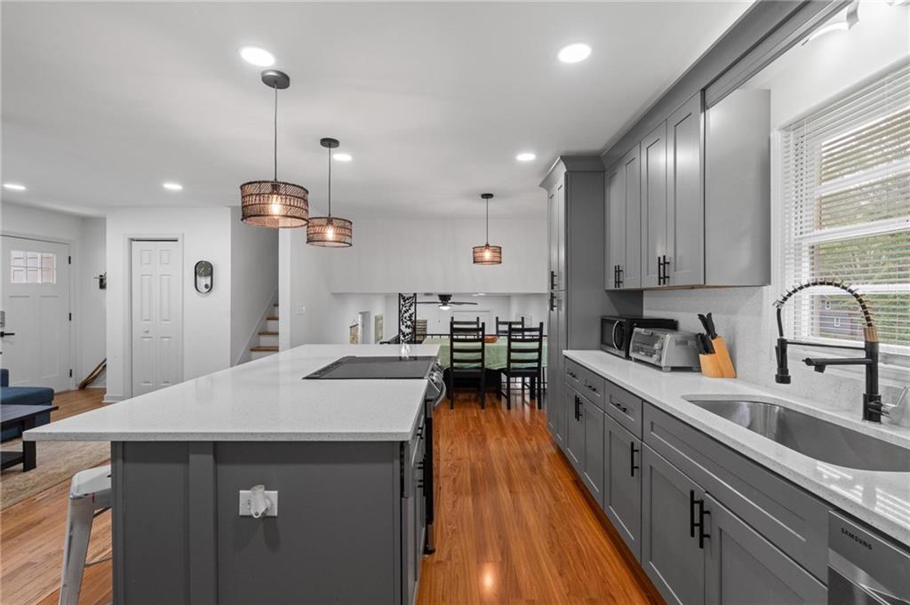 Renovated split level 3-bedroom, 2.5-bath home sited on a generous lot that offers privacy and outdoor living space. The light-filled open floor plan features hardwood flooring, contemporary finishes, and a chef’s kitchen, quartz counters, and ample storage. There are two living areas. The primary suite includes a luxurious ensuite bath with a large walk in shower. Two additional bedrooms upstairs with one full bath and half bath ensuite. Outside, the large, yard provides room for play, gardening or pool.