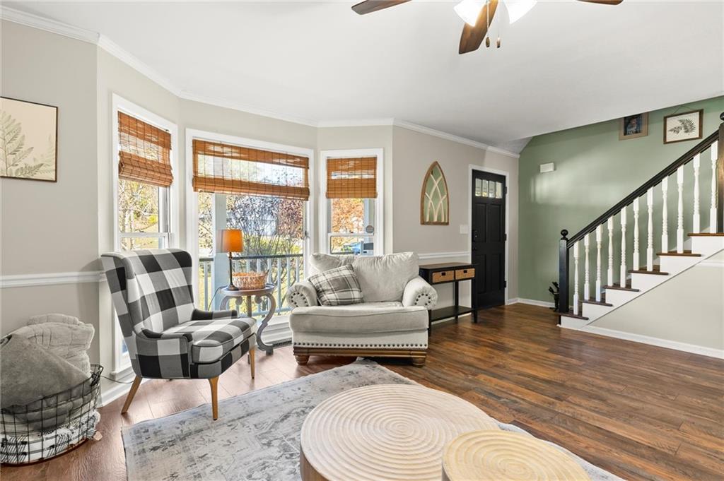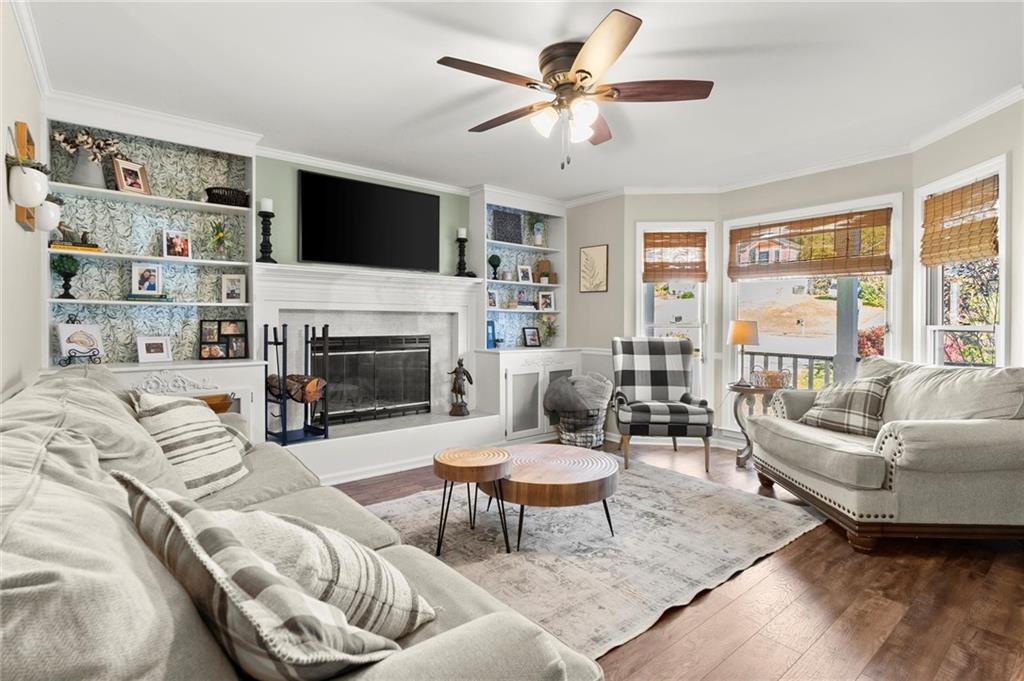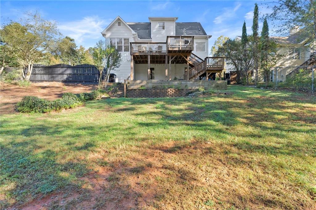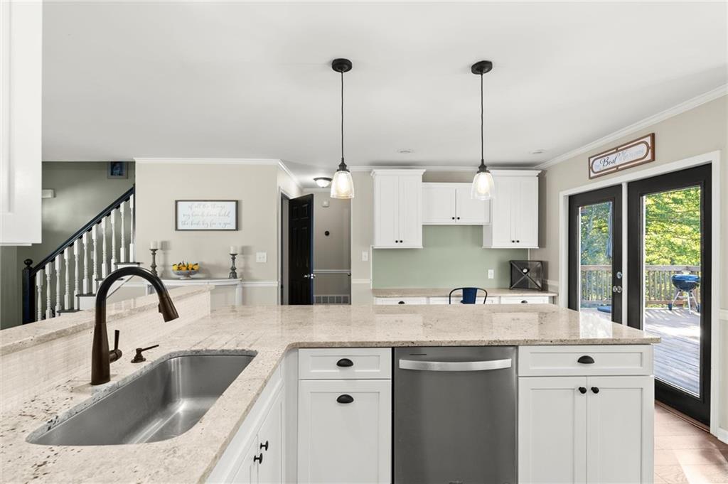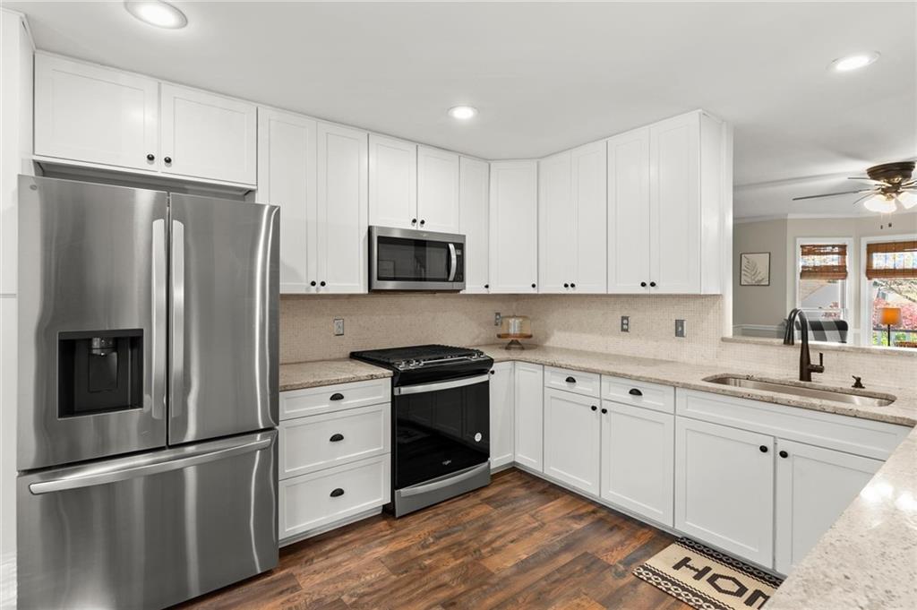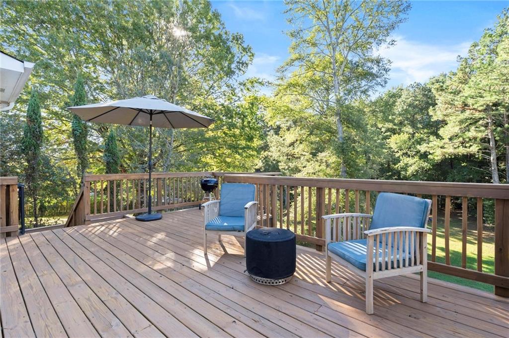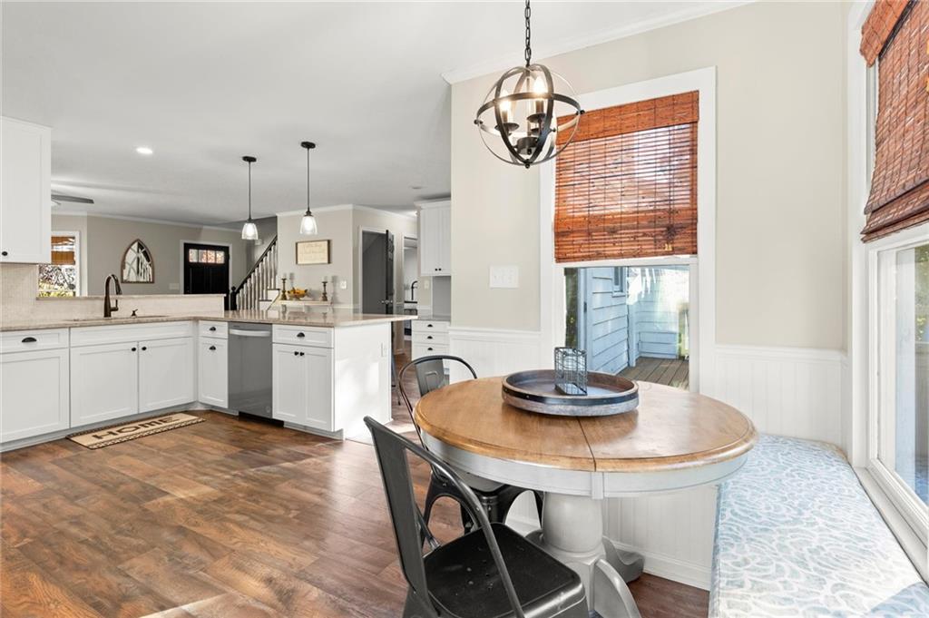 This home is an absolute DREAM! You're immediately greeted by a charming front porch, step inside to a gorgeous, light & bright, open floorplan--the living room is generously sized with a bay window and centered by a cozy fireplace and built in bookcases, and is open to a beautiful white kitchen with granite countertops, stainless steel appliances, and tons of storage, even a long peninsula perfect for hosting/entertaining. Adorable banquette takes advantage of breakfast nook area with extra seating and tons of windows, and built in desk area makes for smart storage space. Primary bedroom on main floor is generous in size with spacious en-suite bathroom including separate tub and shower, and walk in closet. An additional powder room on the main floor as well as laundry conveniently located. Upstairs, find 2 additional spacious bedrooms with dormer window nooks adding to the charm as well as a secondary bathroom. Basement level offers additional living area/office/playroom/exercise space--whatever is needed! And just wait til you see this fenced-in yard! Recently built deck is a great extension of the living area and kitchen and overlooks a sprawling, over half acre flat yard with a fireplace at the back to soak up the outdoors! All of this in the heart of Woodstock--super quick highway access, 5 minute drive to Target or Walmart, 10 minutes to downtown Woodstock, and tons of grocery stores right around the corner (including Aldi, Lidl, Kroger, Sprouts & more!) It's everywhere you want to be, don't miss your chance to call it home!