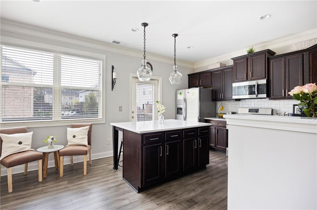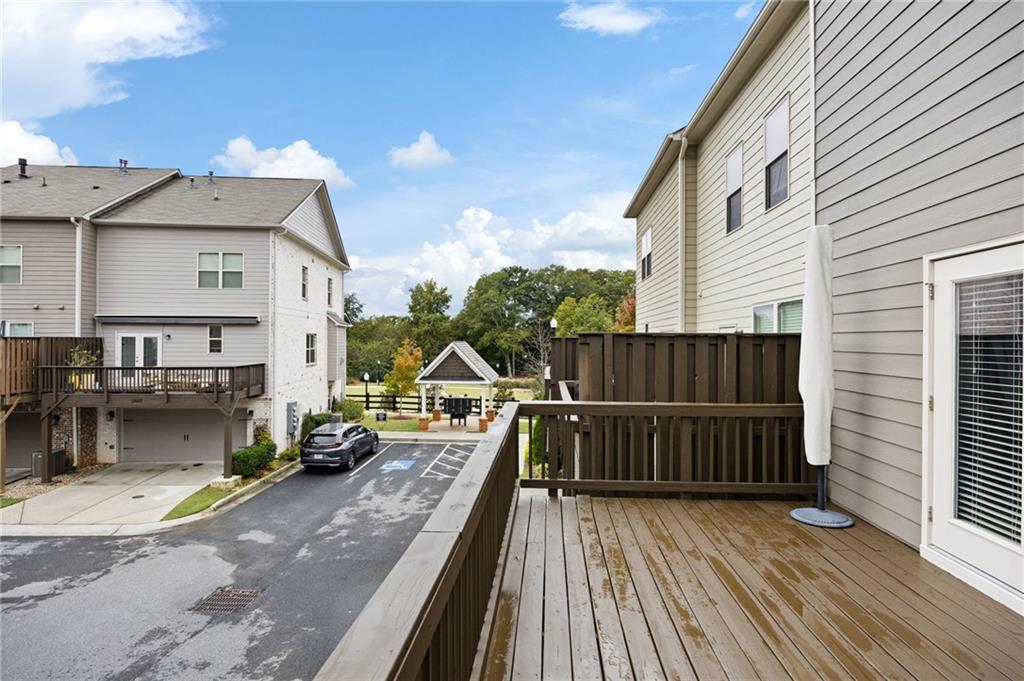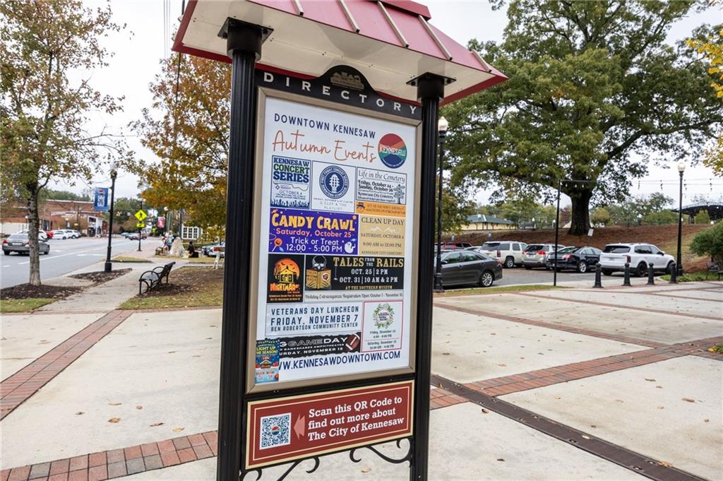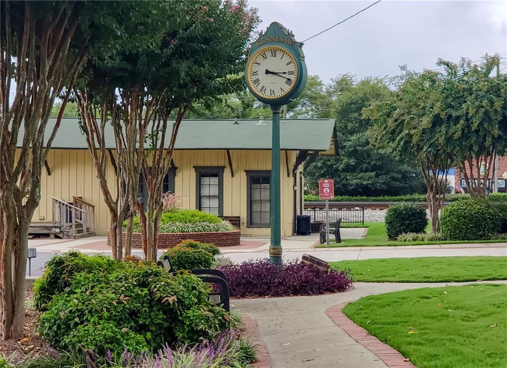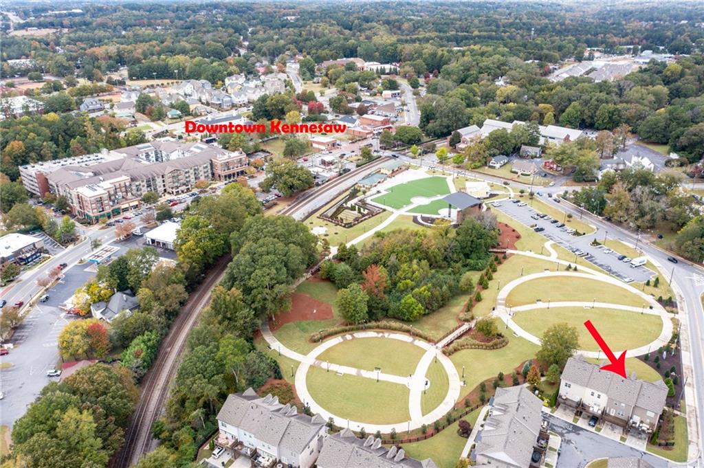 This gorgeous 4-bedroom townhome overlooks the park in downtown Kennesaw. You will love this Texas Floor Plan with 9 ft ceilings, hardwoods, crown molding, and new light fixtures. The main level boasts the chef's kitchen with an oversized island, quartz countertops, stainless appliances, tile backsplash, under cabinet lighting, and Pottery Barn light fixtures. It opens to the eat in area, fireside family room, powder bathroom, and dining room. The dining room is ready to entertain your guests with views of the park. The French doors lead you to your freshly stained deck overlooking the park where you will enjoy a private viewing of the 4th of July fireworks show. Enjoy a cup of coffee on your front balcony that is newly painted. The main floor continues with the walk in laundry room and powder bathroom. The Terrace level will greet your guests with open arms. It is appointed with new light fixtures and an ensuite. The top floor features the owner's suite with gorgeous views of the park, crown molding, a trey ceiling, ceiling fan, his and her closets, tiled shower with bench and dual vanities. There are two additional bedrooms with ceiling fans and a full hall bathroom. You are moments away from the Depot Park & Piedmont Bank Amphitheater, restaurants and shops. This community is close to KSU, Kennesaw Mountain National Battlefield Park, Whole Foods, and I-75, Acworth and Marietta.